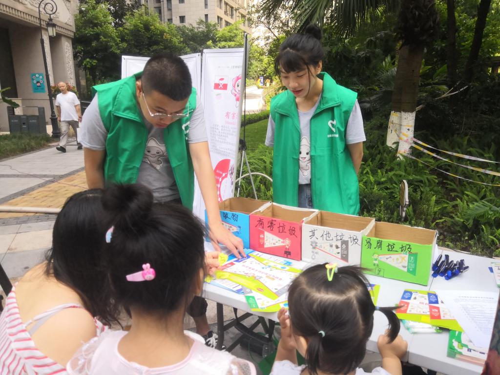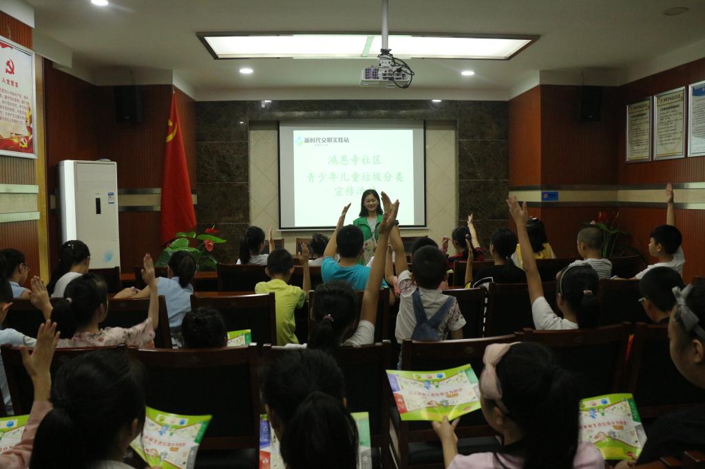 在鸿恩寺社区,团队成员在与社区居委会负责人沟通后,为小朋友们举办了一场垃圾分类交流会,小朋友们踊跃的举手发言,畅谈自己对垃圾分类的认识,随后,在居委会大厅,团队成员们带着小朋友们做起了垃圾分类小游戏,将垃圾卡片放入对应的垃圾桶,以生动形象的方式将垃圾分类的观念从小抓起。