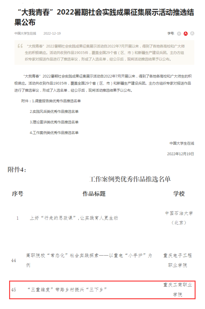近日,中国大学生在线公布了“大我青春”2022年暑期社会实践成果征集展示活动推选结果。我校“助力荣昌兴,奋进青春行”乡村振兴促进团“三重维度”带路乡村振兴“三下乡”工作案例获评暑期社会实践成果优秀作品。
