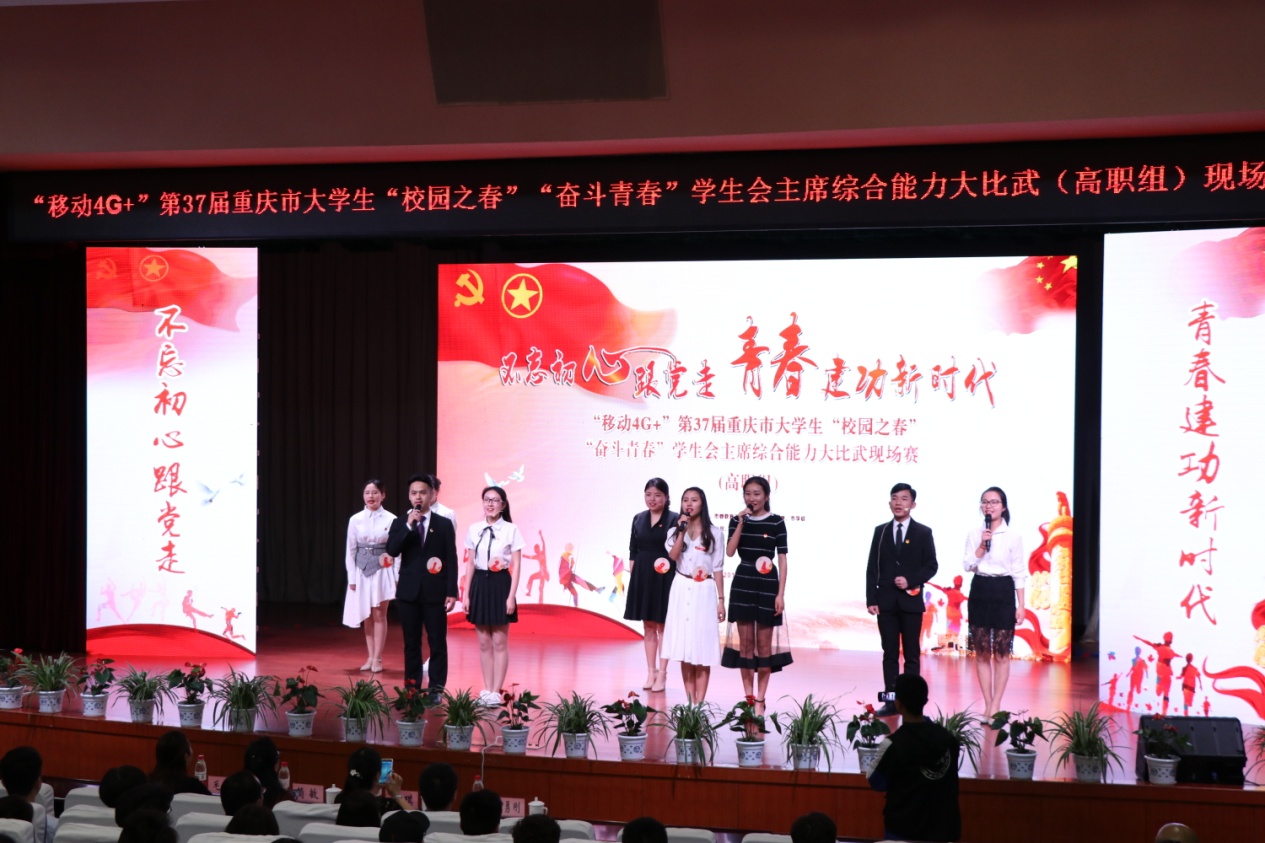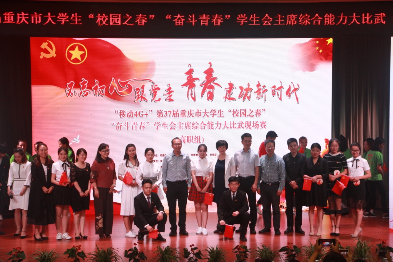 5月9日,“奋斗青春”高校学生会主席综合能力大比武(高职组)现场赛在我校华岩校区成功举办。本次活动由市委宣传部、市委教育工委、市教委、团市委、市学联联合主办。团市委副书记曾凯,我校党委副书记周曦,重庆移动城三分公司副总经理陆艳,团市委高校工作部、九龙坡区团区委、相关高校团委负责同志及全市青年大学生代表共计500余人参加活动,全市青年大学生通过“重庆共青团”微博、“华龙网”APP对活动进行了网络直播。