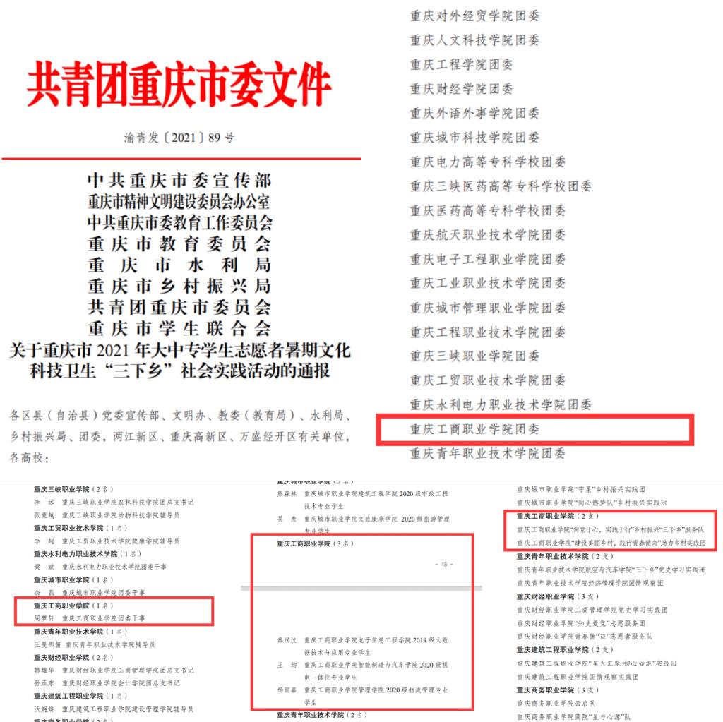 近日,市委宣传部、市文明办、市委教育工委、市教委、市水利局、市乡村振兴局、团市委、市学联对2021年重庆市大中专学生志愿者暑期文化科技卫生“三下乡”社会实践活动中表现突出的集体和个人进行了通报表彰,我校喜获4项殊荣。