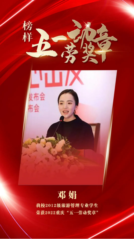 【供稿/管理学院】近日,重庆市人力资源与社会保障局、重庆市总工会公布了2022年重庆五一劳动奖和重庆市工人先锋号表彰对象名单。我校2012级旅游管理专业毕业生邓娟荣获重庆市五一劳动奖章。