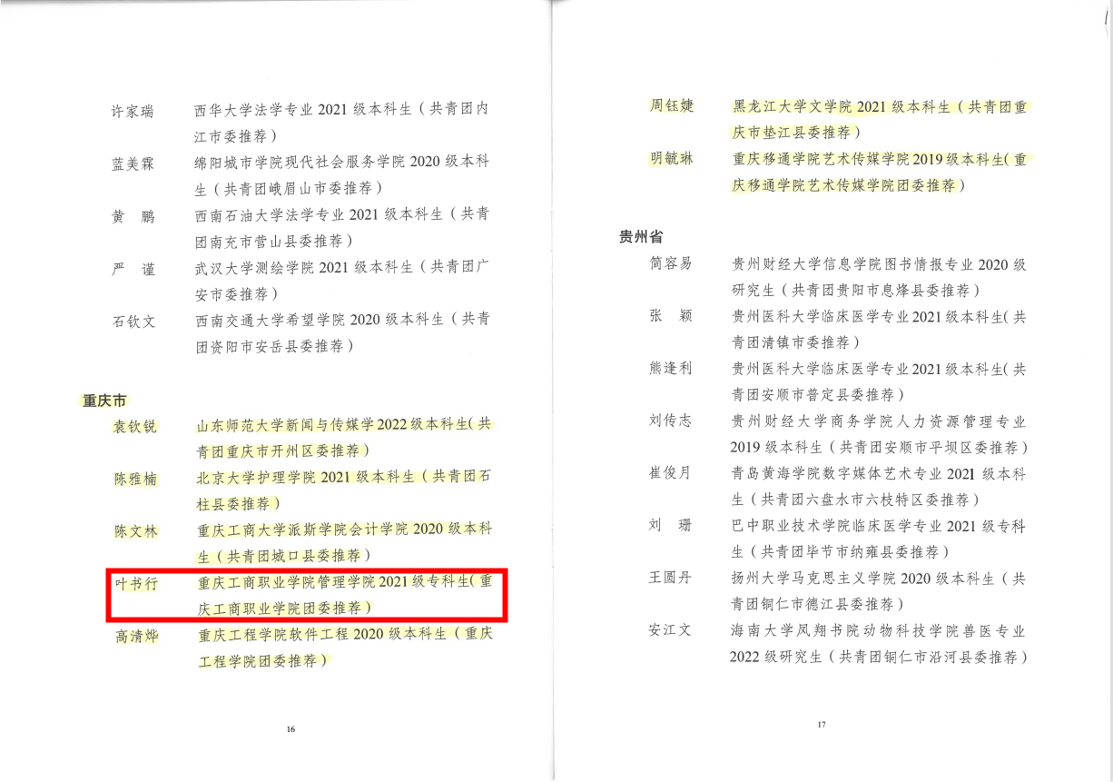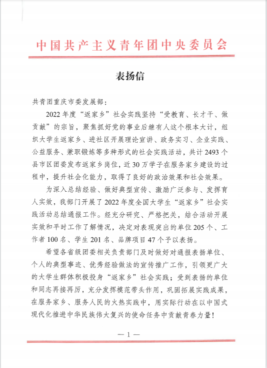 近日,共青团中央通报表扬了一批在2022年度全国“返家乡”社会实践活动中表现优秀的单位、个人及品牌项目。我校管理学院2021级连锁经营与管理1班学生叶书行上榜,获全团通报表扬。