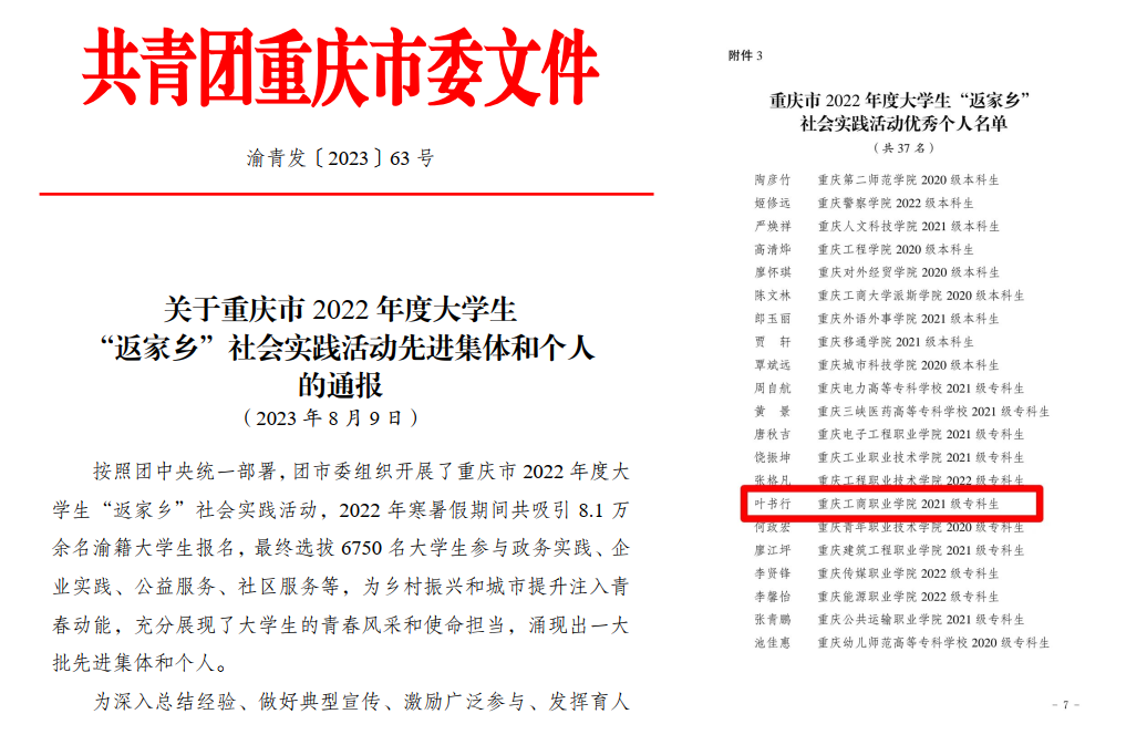 近日,共青团重庆市委通报重庆市2022年度大学生“返家乡”社会实践活动先进集体和个人,我校管理学院2021级连锁与经营管理1班学生叶书行获优秀个人称号!