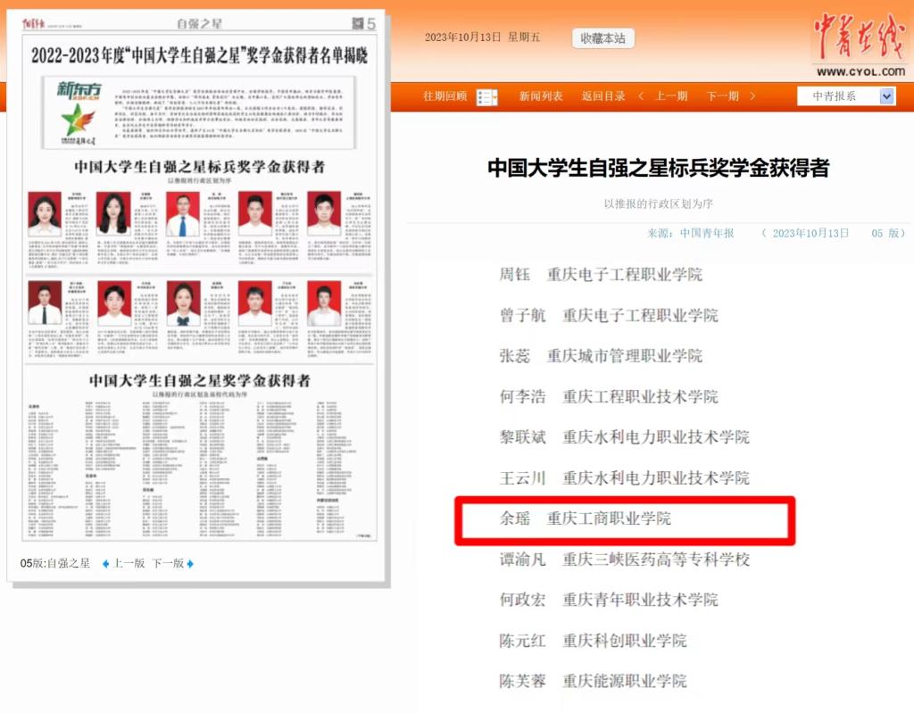 【供稿/智能制造与汽车学院、校团委】近日,由共青团中央、全国学联指导中国青年报社、新东方教育科技集团、中国青年创业就业基金会联合举办的2022-2023年度“中国大学生自强之星”奖学金获得者名单揭晓,我校智能制造与汽车学院2020级新能源汽车技术专业余瑶同学荣获“中国大学生自强之星”称号。