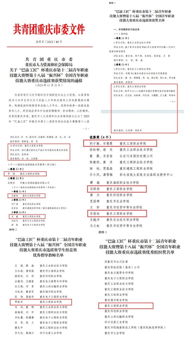 11月21日,共青团重庆市委、重庆市人力资源和社会保障局联合主办的2023年“巴渝工匠”杯重庆市第十二届青年职业技能大赛暨第十八届“振兴杯”全国青年职业技能大赛重庆市选拔赛公布获奖名单。我校师生在此大赛中荣获佳绩,获得一等奖2个、二等奖1个、三等奖1个、优胜奖4个,城市建设工程学院贾晓东老师获学生组竞赛优秀指导教师奖,我校荣获优秀组织奖。