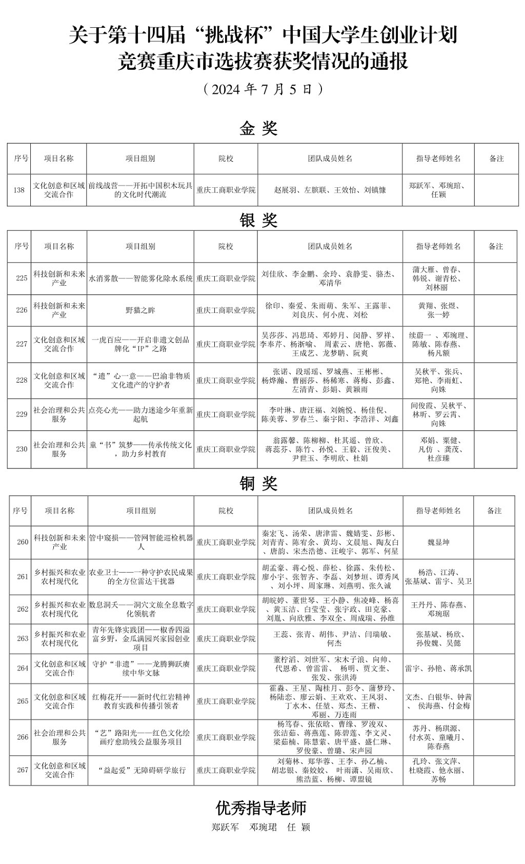 近日,由团市委、市教委、市人力社保局、市科协、重庆社科院、市学联共同组织开展的第十四届“挑战杯”中国大学生创业计划竞赛重庆市选拔赛结果揭晓,我校共有15个项目进入市赛角逐,最终1个项目获得金奖,6个项目获得银奖,8个项目获得铜奖,郑跃军、邓琬珺、任颖3名老师荣获“优秀指导老师”。