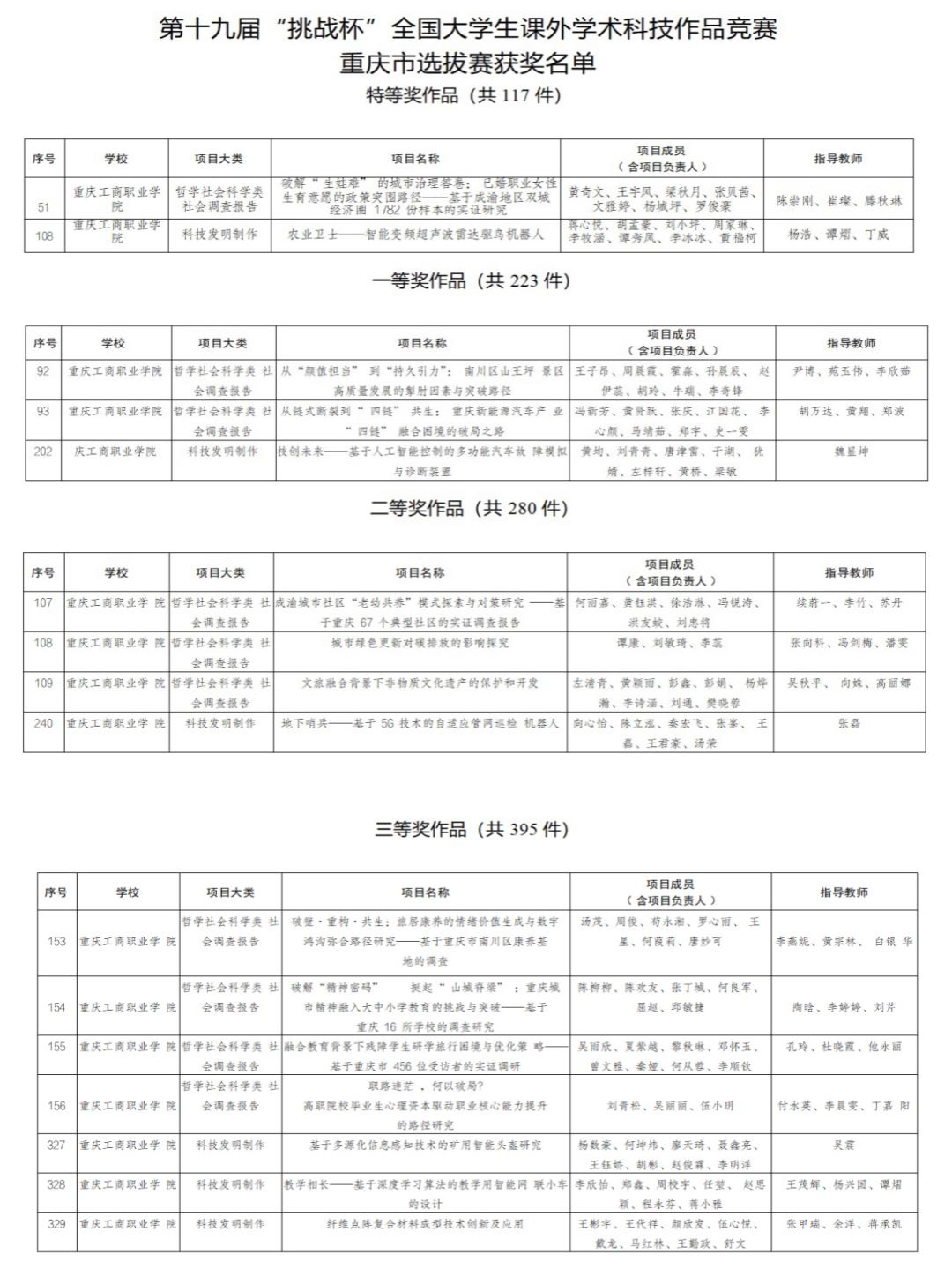 【简讯】重庆工商职业学院在第十九届“挑战杯”全国大学生课外学术科技作品竞赛重庆市选拔赛中获佳绩