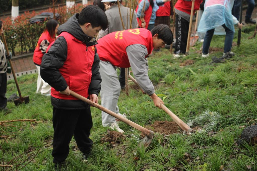 【供稿/校工会、后勤管理处、校团委】为深入学习贯彻习近平生态文明思想,植树节当天,党委组织部、校工会、后勤管理处、校团委、校学生会联合组织师生代表在合川、华岩两校区同步开展了“‘植’此新绿见春山 青春‘绿’动志愿行”学雷锋义务植树活动。此次义务植树活动在华岩校区6号楼旁、合川校区桃花岛共种植树苗90株。师生代表们在绿化工人的指导与帮助下,顺利完成植树活动,为校园增添美丽生机贡献青春力量。
