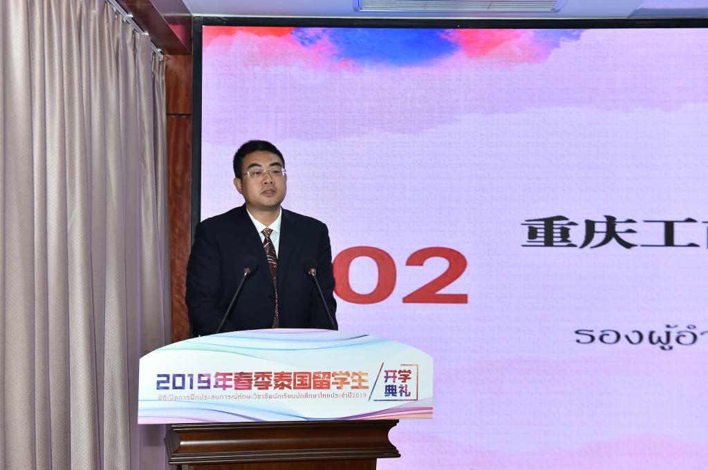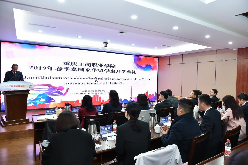 3月15日,我校2019年春季泰国留学生开学典礼在合川校区举行。来自泰国15所职业学院的78名留学生,将分别在我校管理学院、传媒与设计学院、城市建设工程学院、电子信息工程学院学习专业技能和中国语言文化。泰国教育部高等职业教育代表团一行9人、校长李国、副校长江涛、西南大学外国语学院(泰国孔敬大学孔子学院原院长)王贵彬先生、二级学院以及相关部门负责人出席了典礼。开学典礼由副校长胡继明主持。
