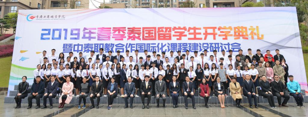典礼上,学校领导为泰国留学生代表佩戴了重庆工商职业学院校徽。会后,泰国来宾、留学生、学校领导和相关单位(部门)负责人在行政楼前合影留念。