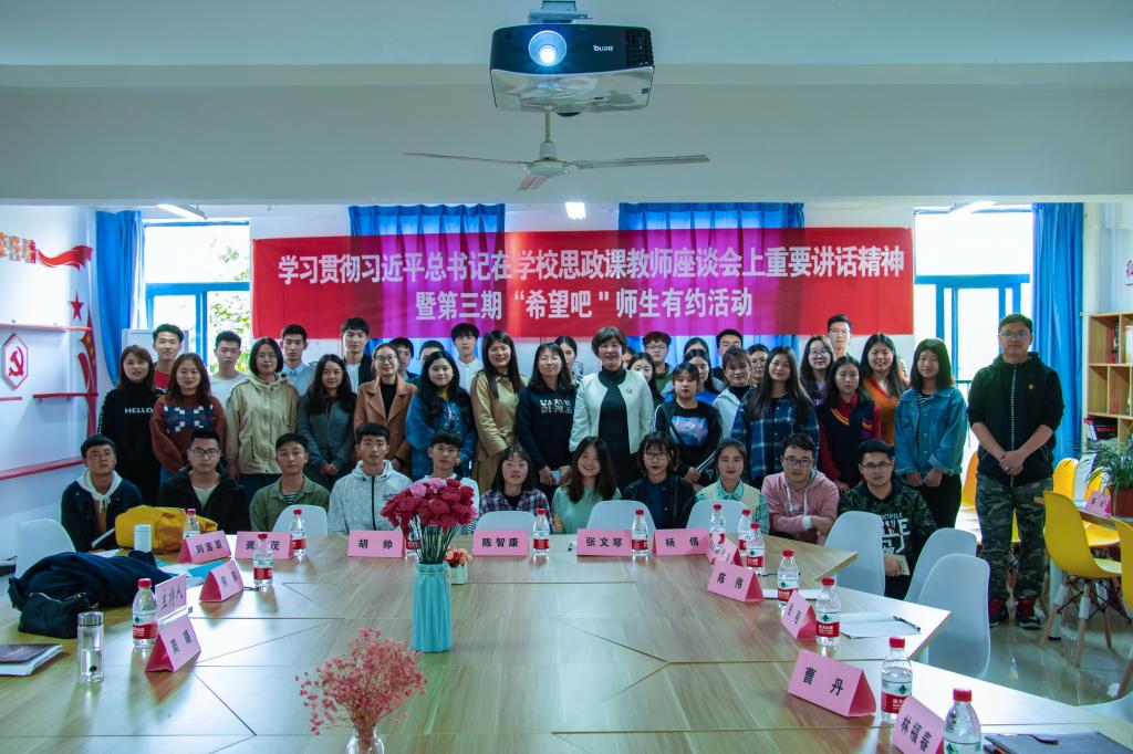 为深入学习习近平总书记在全国学校思想政治理论课教师座谈会上的重要讲话精神,3月28日下午,党委副书记周曦同志走进“希望吧”师生有约,与思政教研室教师代表和青年学生代表共同研讨思想政治理论课“教”与“学”有机结合的“金点子”。活动由党委宣传部常务副部长何菲同志主持。